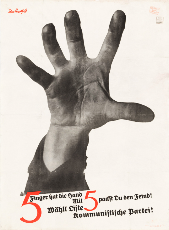 <5 Fingers Has The Hand>는 1928년 독일 공산당(KPD) 선거 운동을 지원하기 위해 존 하트필드가 제작한 포토몽타주 포스터로서 ‘손은 다섯 개의 손가락을 갖고 있다! 이 다섯으로 적(나치당)을 움켜잡자!’라고 적혀있다.