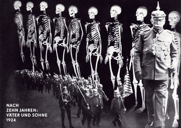 존 하트필드의 또 다른 포토몽타주 <10년후, 아버지들과 아들들(After Ten Years, Fathers and Sons)>은 제1차 세계대전 발발 10주년을 맞이하여, 1924년에 제작한 포토몽타주이다.