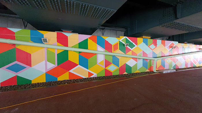 좌우에 위치한 두 개의 타일 벽화는 소리천의 물결 모양, 운정·금촌 지역의 건물들, 날개 달린 하트 그리고 나무와 산 등 자연을 상징하는 이미지들이 한 화면에 다채롭게 구성되며 화합과 공존의 메시지를 담고 있다.