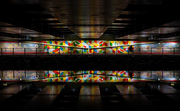 중앙은 현대미술가 빅토르 바자렐리(VIctor Vasarely)의 작품을 레퍼런스로 하여 옵아트 기법으로 제작되었으며, 기하학적인 다양한 컬러의 사각형 색면 구성으로 화려한 입체감과 공간적 팽창의 느낌을 표현하였다.