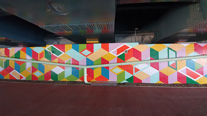 좌우에 위치한 두 개의 타일 벽화는 소리천의 물결 모양, 운정·금촌 지역의 건물들, 날개 달린 하트 그리고 나무와 산 등 자연을 상징하는 이미지들이 한 화면에 다채롭게 구성되며 화합과 공존의 메시지를 담고 있다.