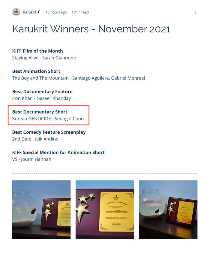 전승일 작품 <금정굴 이야기> Karukrit International Film Festival 수상