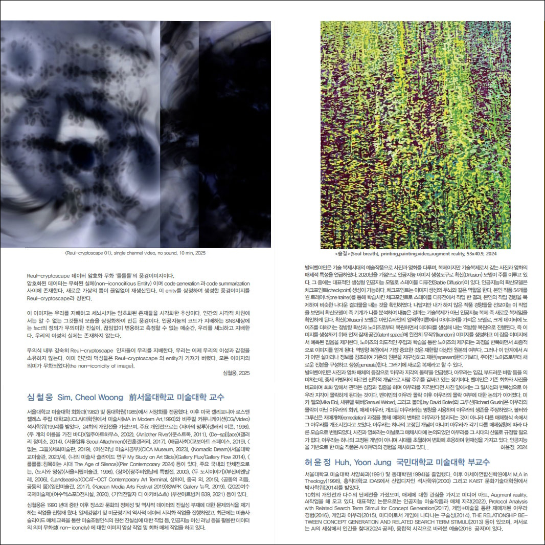 매체이론과 AI 생성 논리를 이론적으로 연구하는 것과 함께 이를 작업으로 이어가고 있는 허윤정 작가는 체크포인트(check- point) 생성이 가능한 생성형 인공지능 모델인 스테이블 디퓨전(Stable Diffusion)을 사용하여 자신의 작품 54개를 학습시킴으로써 작가의 기존 작업 경향의 결과물들을 얻어냈다. 이 작업 과정에는 데이터에 노이즈를 더해가는 정방향 확산과 노이즈로부터 복원하면서 데이터를 생성하는 역방향 복원을 진행하였는데 이때 작가가 중요하게 고려한 것은 기존의 원본을 재구성하고 재현(represent)하기보다는 새로운 진본을 생성(generate)하였을때 이 작업의 원본성과 관련된 문제가 제기되는 지점인데 작가는 이를 ‘재매개된 AI 아우라’라는 새로운 개념을 통해 그 해법을 제시하고자 한다. 발터 벤야민은 원본이 사진 등의 방법으로 기술 복제될 때 ‘아우라’ 지각의 몰락을 예상했지만 작가는 AI에 의해 원본이 그대로 복제되는 것이 아니라 원본에 녹아있는 저자성의 일정한 성향을 분석하여 복제보다 생성의 방식에 의해 일종의 새로운 원본을 제시하면서 아우라에 대한 새로운 개념을 제안하고자 하는 것이다. 작가는 이를 통해 AI 시대 이후의 예술작품에 대해 창작 주체에 대한 문제와 저자성, 그리고 예술 작품의 아우라 문제까지 다양한 논의의 화두를 이끌어낸다. 이번 전시는 이처럼 AI가 가져온 변화로부터 이후 논의가 필요한 예술의 본질적 영역으로부터 매체와 기술적 변화로 인해 파생된 문제들을 작업을 통해 점검해보면서 기존의 제 개념에 대해 재검토와 성찰을 해 보기 위해 기획된 전시이다. 물론 어떤 결론을 만들어낼 수 없을 것을 예상하지만 이번 전시는 이 시대에 필요한 질문들을 만들어감으로써 이후 시대의 예술의 향방을 모색해 보려는 것에 의미를 두고자 한다.