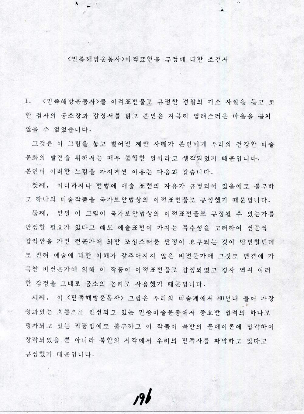"이 그림을 법의 판정에 맡기려는 검찰의 시도 자체가 잘못된 것이며, 이 시도는 즉각 철회되어야 한다."