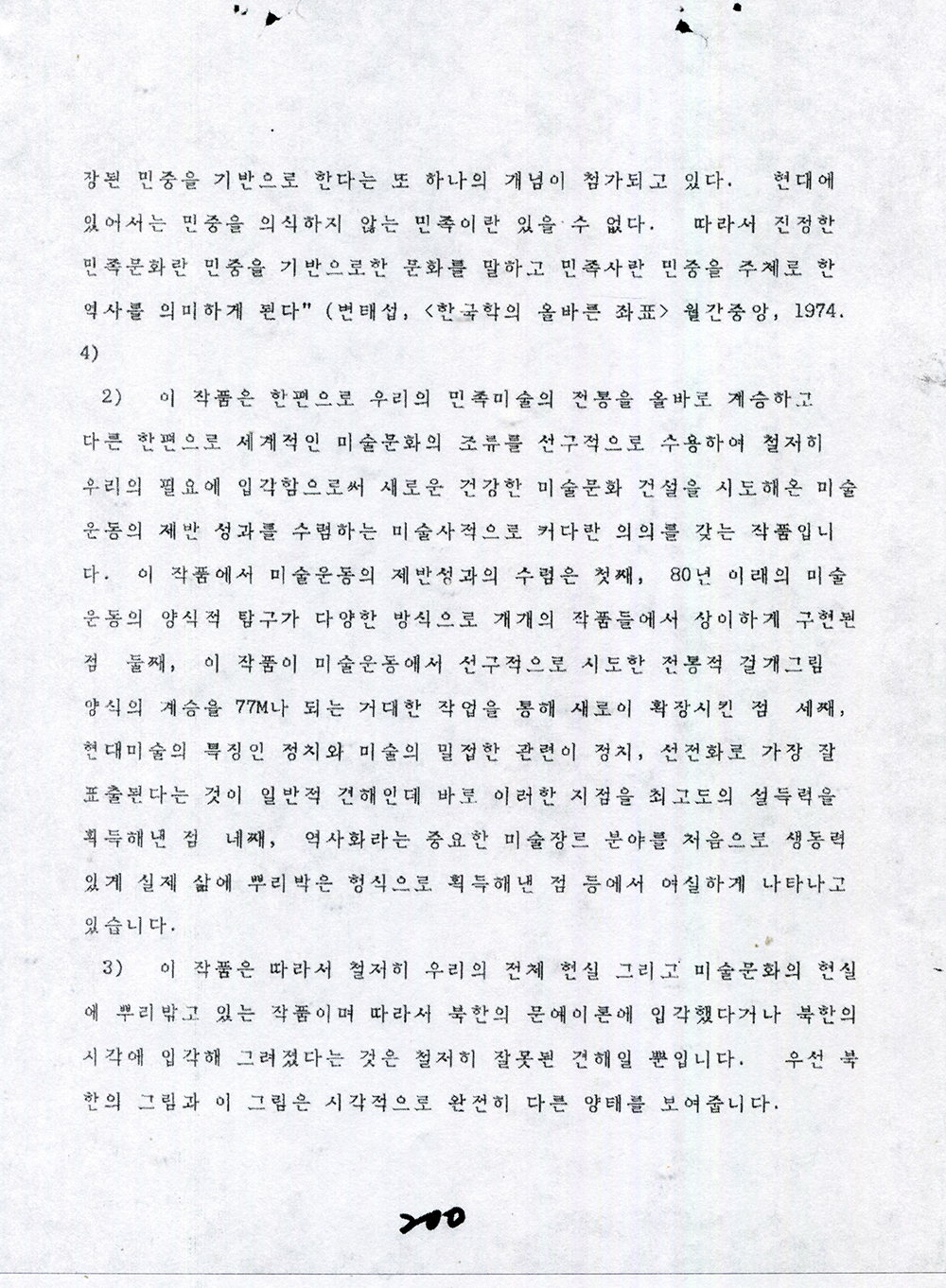 "이 작품은 우리의 민족미술의 전통을 올바로 계승하고, 다른 한편으로 세계적인 미술문화의 조류를 선구적으로 수용하여 철저히 우리의 필요에 입각함으로써 새로운 건강한 미술문화 건설을 시도해온 미술운동의 제반 성과를 수렴하는 미술사적으로 커다란 의의를 갖는 작품입니다."