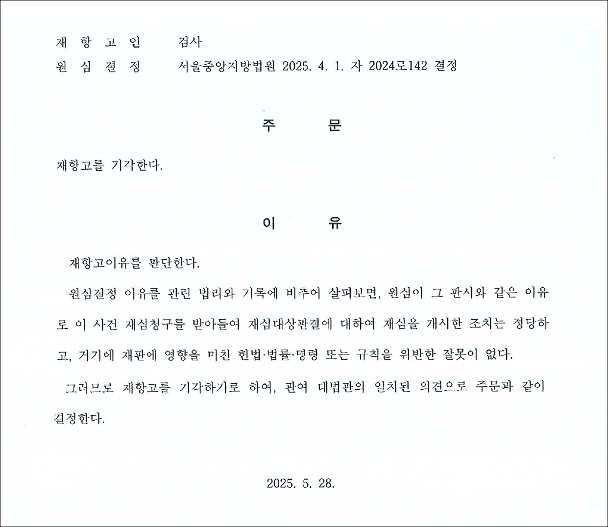 그런데 극우 성향 검사는 이에 불복하여 "즉시항고'(2024.08.30)와 "재항고"(2025.04.08)를 반복하였고, 이로 인해 재심 개시가 지연되면서 대법원까지 사건이 올라갔습니다. 그리고 2025년 5월 28일 대법원은 대법관 4명의 일치된 의견으로 검사의 재항고를 기각시켜서 마침내 36년만에 재심이 열릴수 있게 되었습니다.